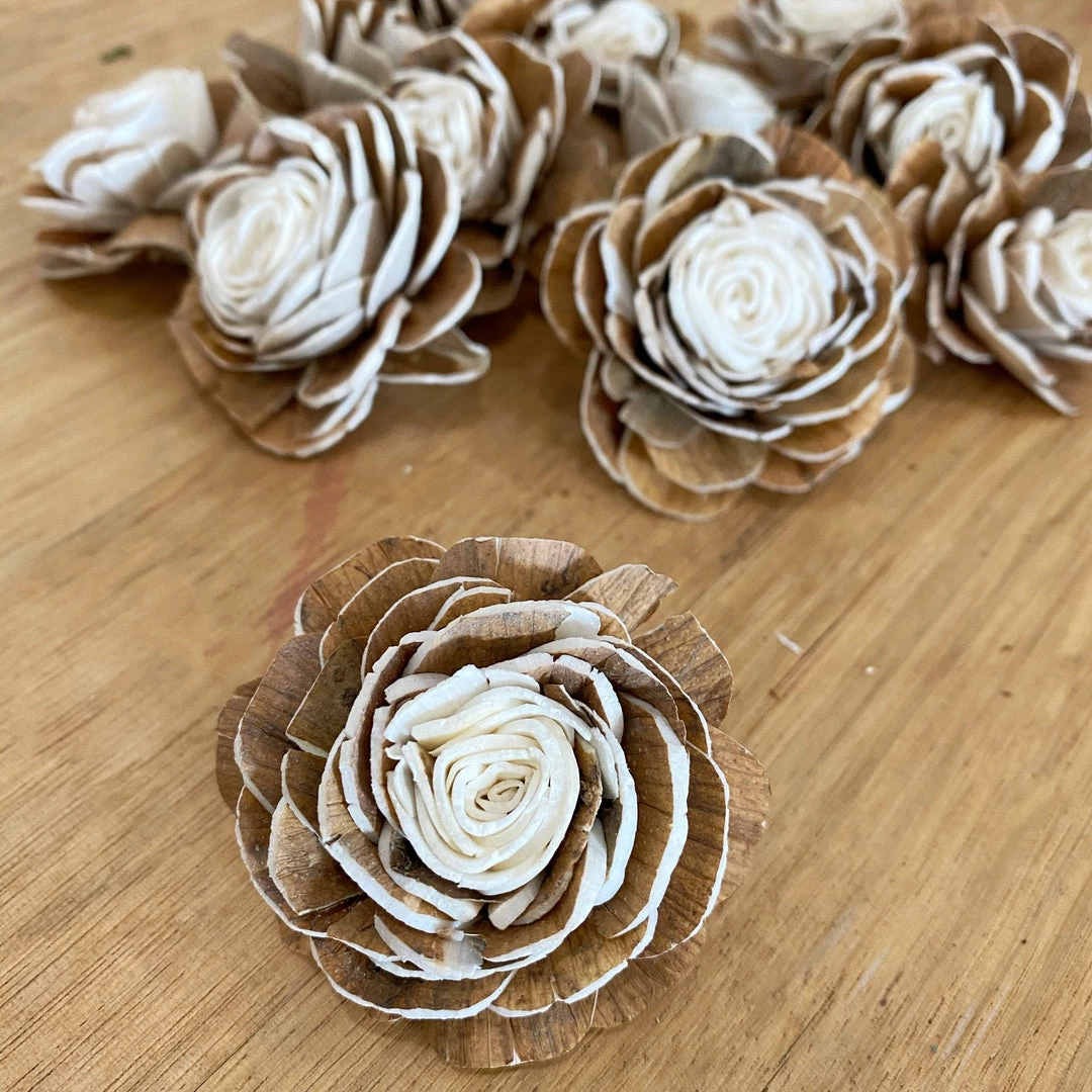 Sola flowers are not fresh flowers. They are handmade wood flowers. The texture is similar to a really thin version of balsa wood. Because they are handmade, and made from natural materials, no two are exactly alike. Brown veining, sometimes small holes from a “knot” in the wood are on some of the flowers due to being made from the bark of a tree. Ā