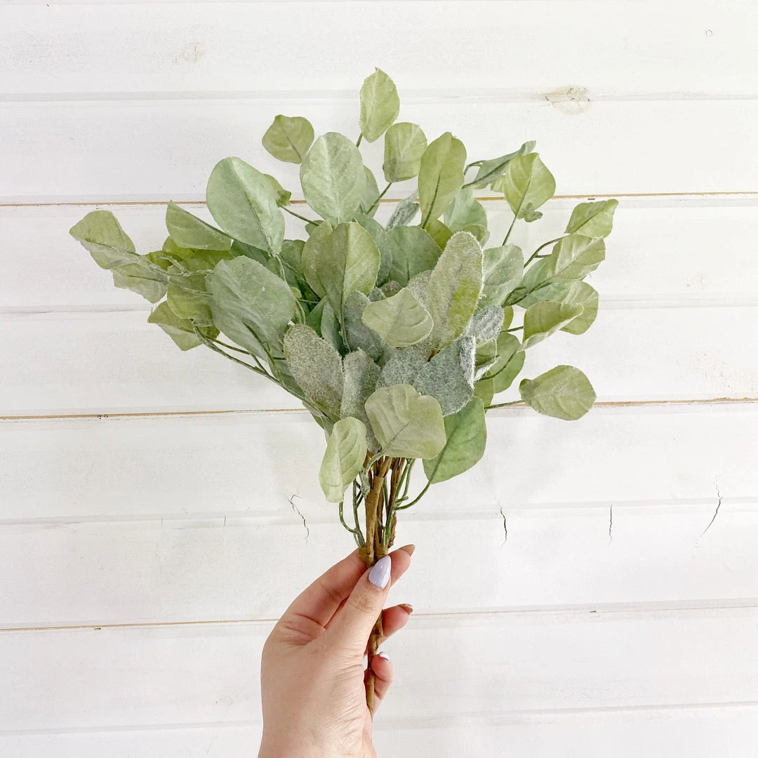 An artificial greenery with such a great flow to it! Mixed yellow toned eucalyptus and very flocked lambs ear leaves.