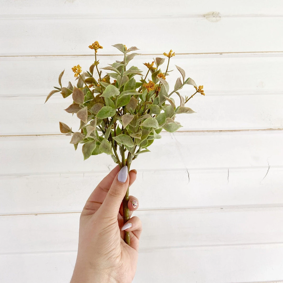 Faux laurel leaves and features orange (pumpkin) colored tiny berries.
