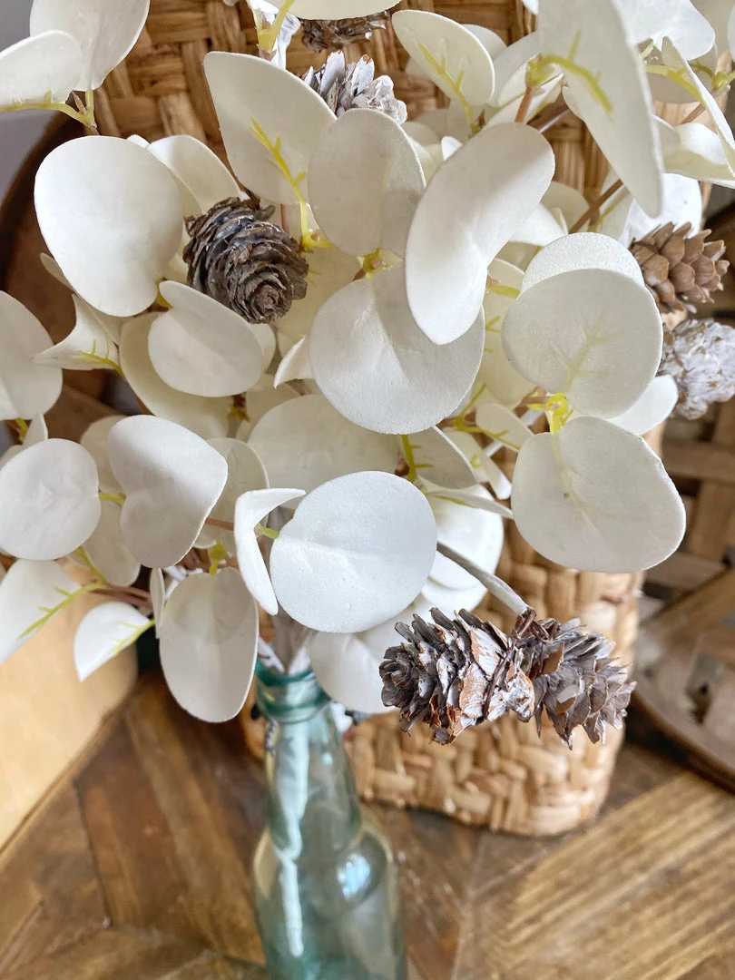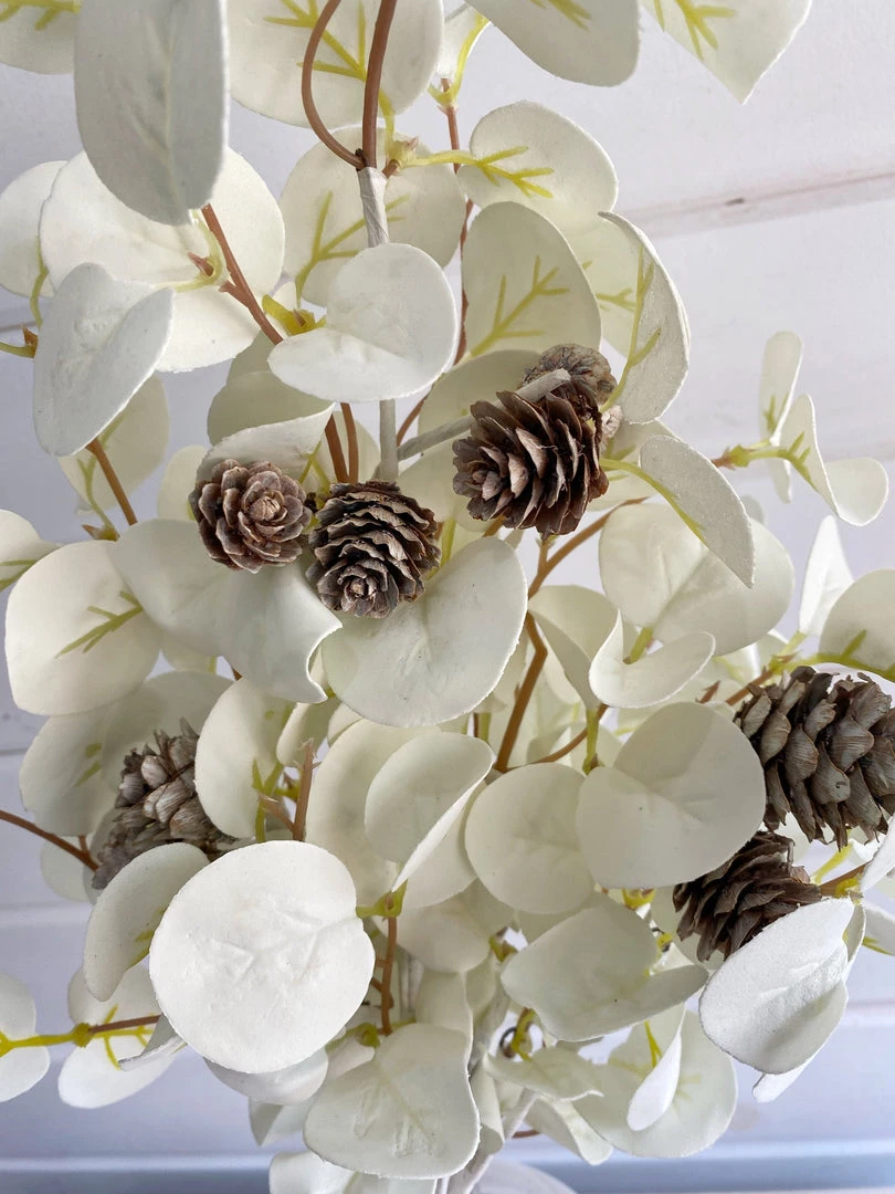 These faux eucalyptus leaves are super soft to the touch. Featuring silver frosted green and winterized pinecones