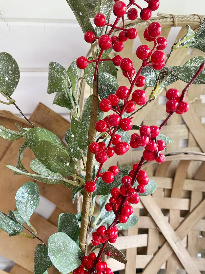 This faux berry pickĀ features artificial red berries and wide dark green leaves sprinkled with wide silver glitter