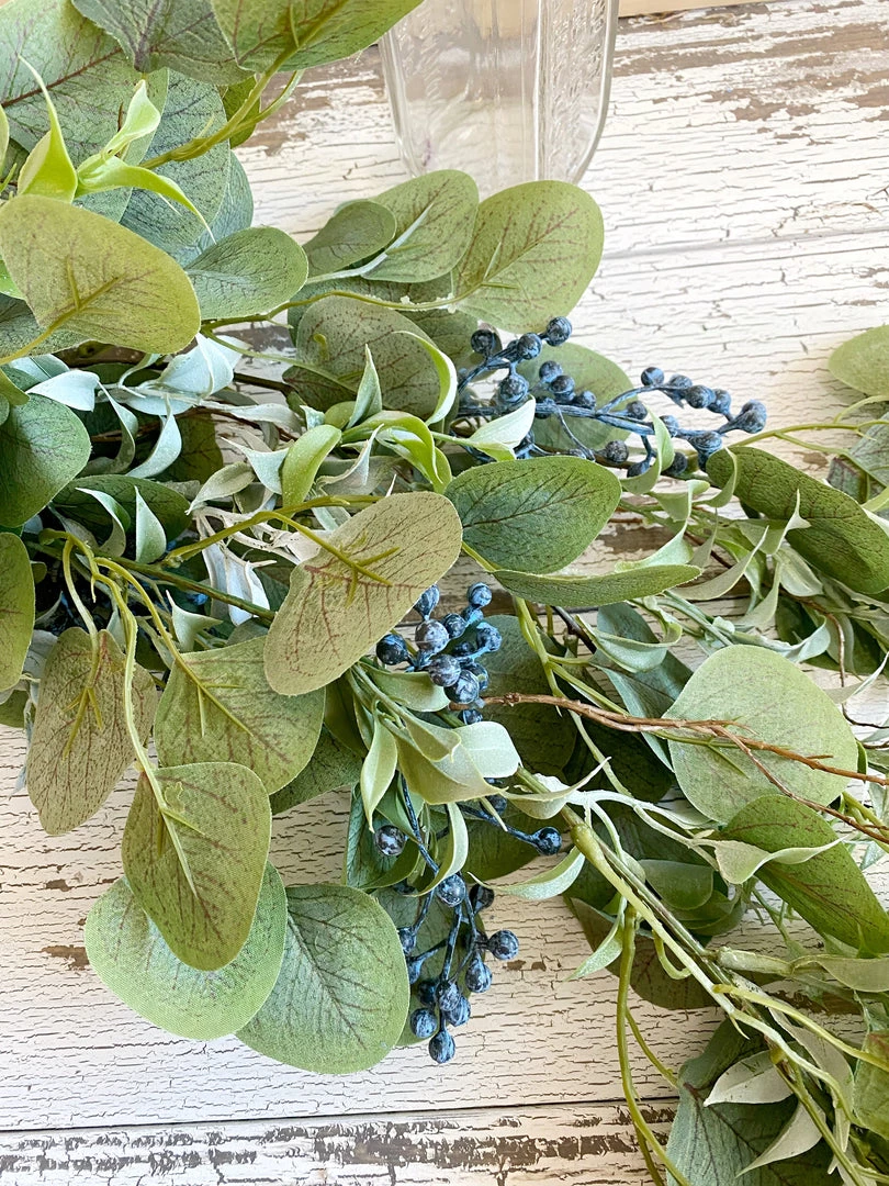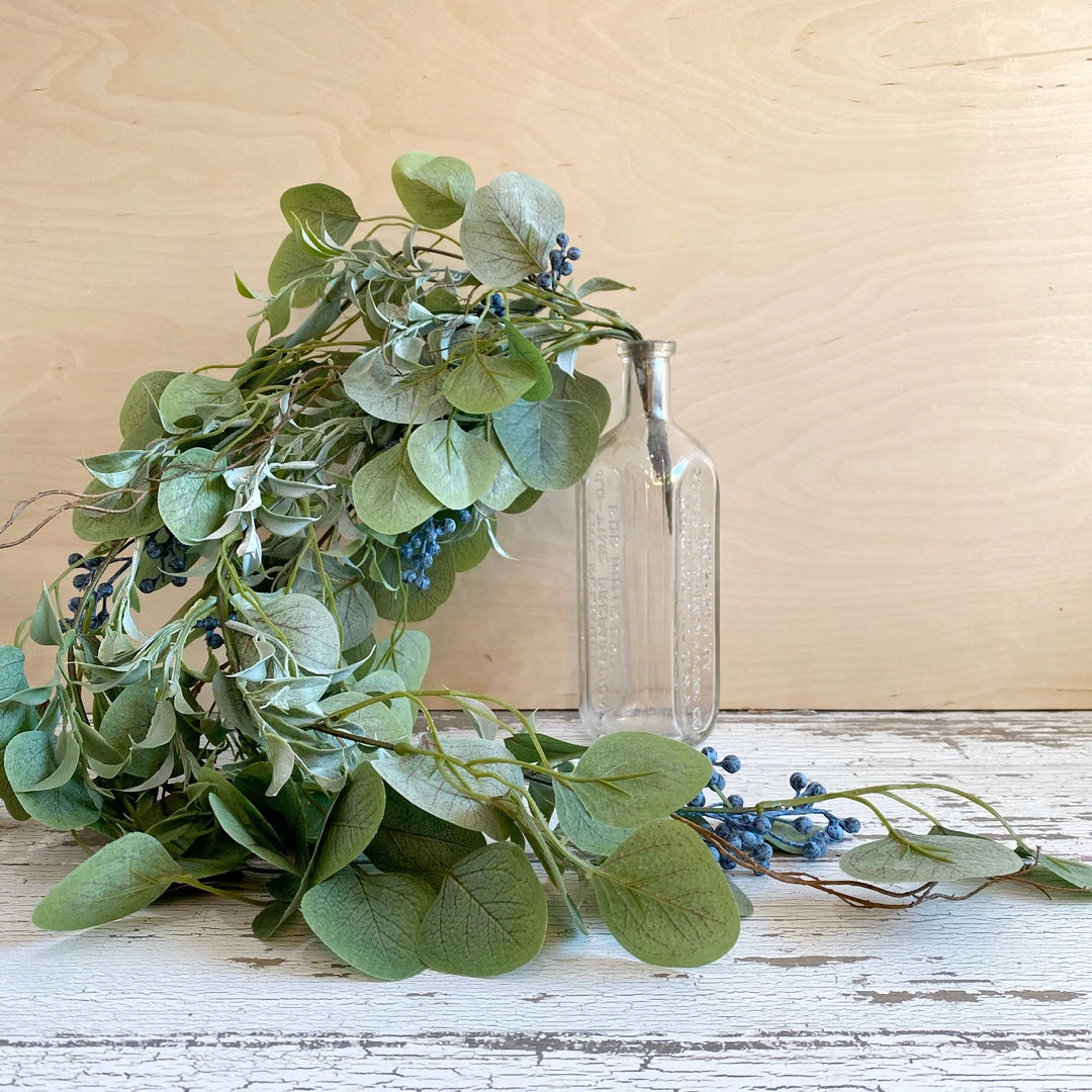 AĀ hangingĀ silver dollar eucalyptus, faux branches, sprinkling of other leaves, and berries in blueĀ sprinkled throughout.Ā This fauxĀ vine hangs beautifully for floral bouquets.Ā Is perfect for wild and cascading bouquets.