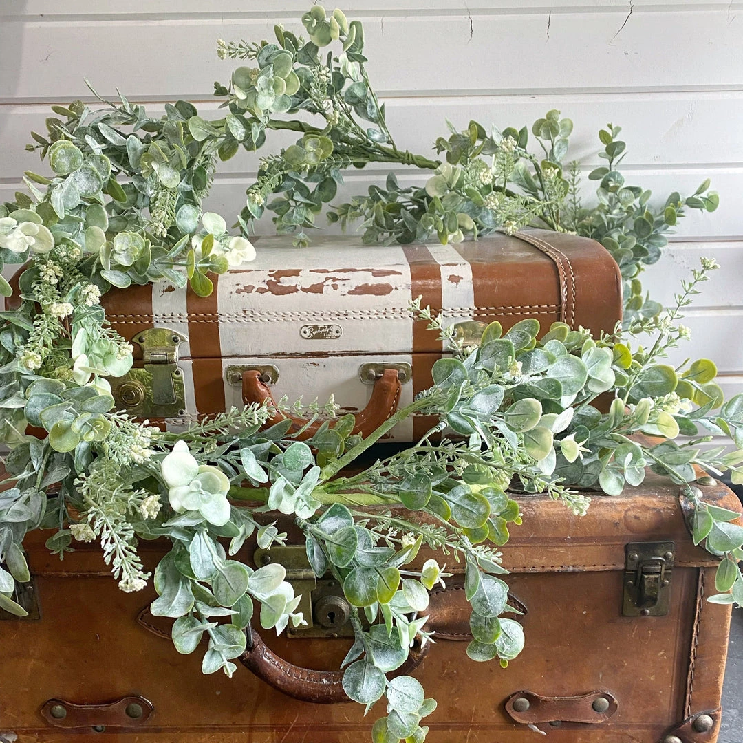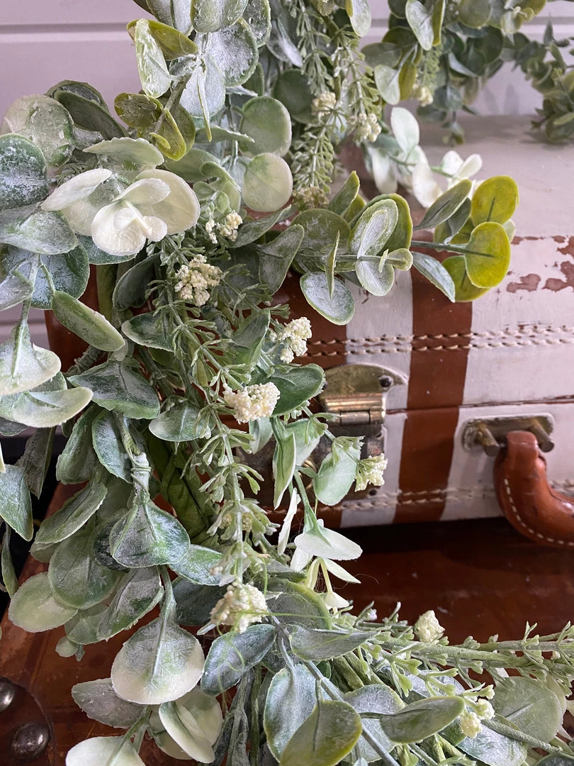 A faux mixed bunch. Mix of a few different smaller frosted/powdered eucalyptus and sprinkled throughout is dainty white filler.Â